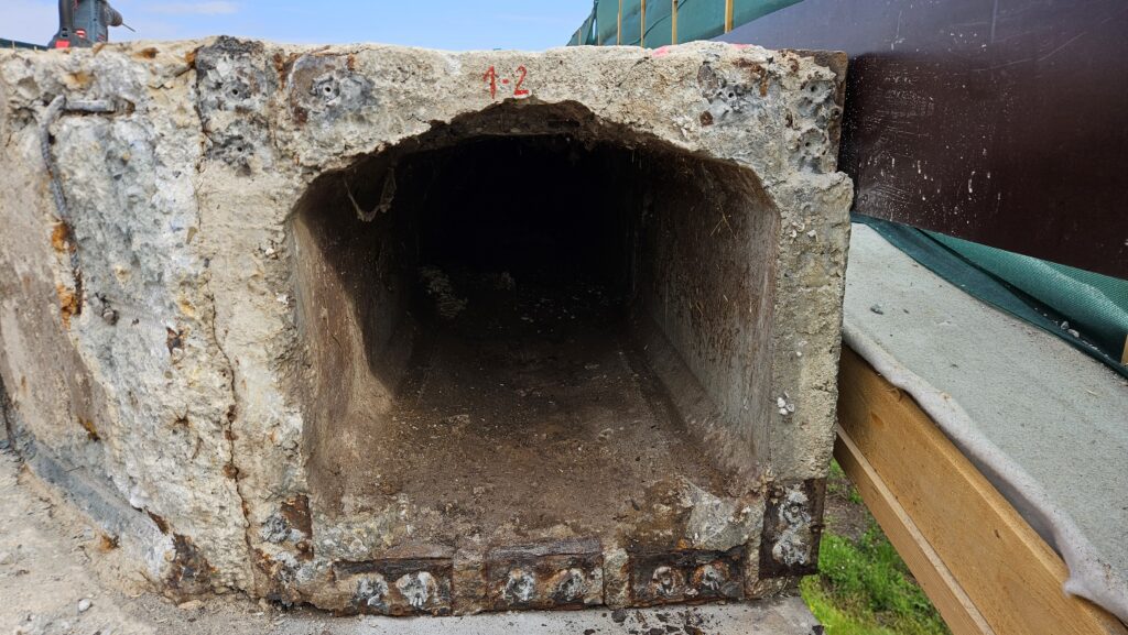 V průběhu realizace rekonstrukce mostu byla provedena doplňková diagnostika předpjatého mostu tvořeného nosníky typu KA. Cílem tohoto šetření bylo detailní posouzení skutečného stavu nosníků nosné konstrukce, a to prostřednictvím sondáže předpínací výztuže a vyhodnocení kvality injektáže skrze injektážní otvory kotev. Díky těmto postupům bylo možné ověřit stav předpínací výztuže, endoskopicky odhalit případnou korozi a potvrdit správnou funkčnost injektáže, která má zásadní vliv na ochranu výztuže před korozí.