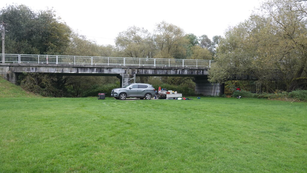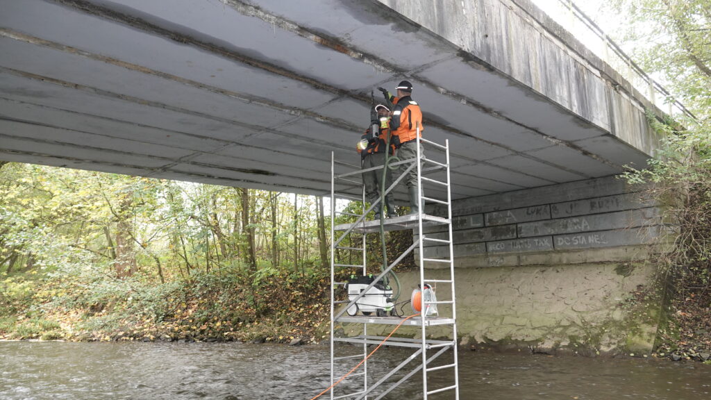 V rámci zakázky byla realizována podrobná diagnostika třípolového předpjatého mostu z nosníků typu KA, který překonává řeku Radbuzu. Diagnostické práce zahrnovaly detailní sondáž a vyhodnocení stavu předpínací výztuže, odběr jádrových vývrtů z nosníků i spodní stavby, provedení sond do vozovkových vrstev a vizuální prohlídku celého mostního objektu. Díky kombinaci těchto metod bylo možné získat přesný obraz o technickém stavu konstrukce, identifikovat kritická místa a stanovit míru opotřebení jednotlivých prvků. Nedílnou součástí diagnostiky byl také statický výpočet zatížitelnosti, který určil skutečné rezervy mostu při zatížení a ověřil jeho spolehlivost pro další provoz.