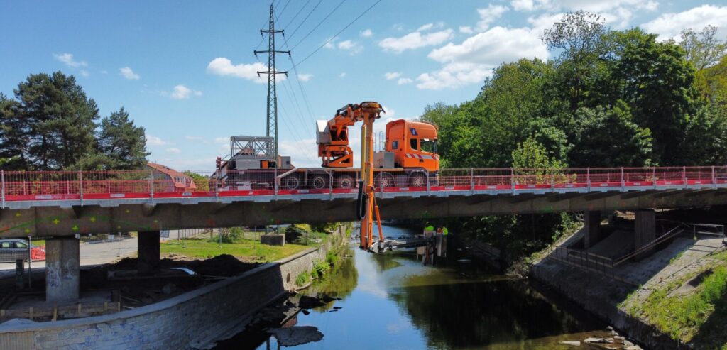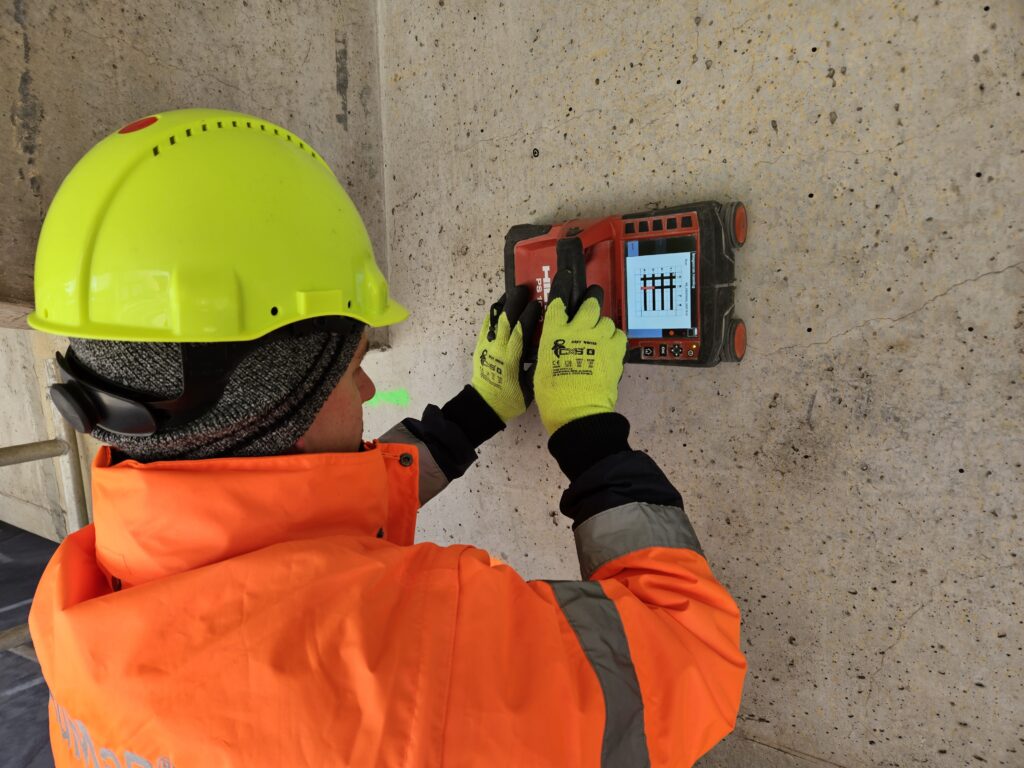 Vyhledávací diagnostický průzkum byl zaměřen na nedestruktivní určení polohy stávajícího předpínacího systému nosné konstrukce s cílem vyznačení polohy kabelových kanálků a ověření míst pro vrtání. To umožnilo bezpečné naplánování a provedení navazujících prací bez rizika poškození původního předpínacího systému. Současně probíhaly kontrolní práce během vrtacích činností spojených s přípravou nových deviátorů a vedením dodatečného předpětí.